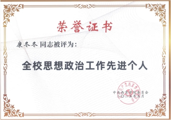 2016年起,康冬冬同志开始兼职从事思想政治工作,现担任中共西京学院机关委员会纪检委员。面对纪检工作的严肃性与复杂性,他迅速转变角色、主动钻研业务,系统学习《中国共产党纪律处分条例》《中国共产党廉洁自律准则》等党内法规,筑牢党风廉政建设底线,推动机关党建与业务工作深度融合。