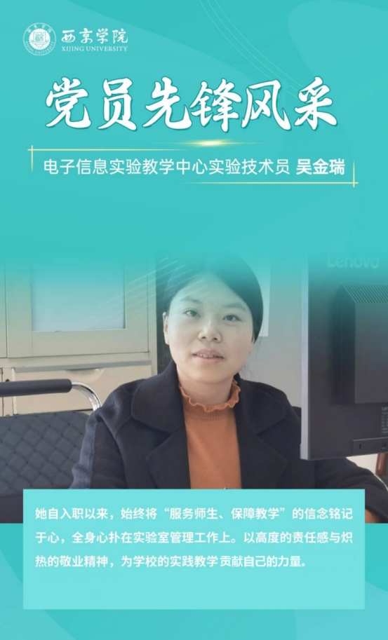 在日常工作中,吴金瑞积极发挥先锋模范作用,以身作则,为团队树立了良好的榜样。在2024年度西京学院样板实验室评选活动中,经她精心管理的电路系统实验室脱颖而出,被评为样板实验室。在承担大量实验室管理工作的同时,她从未停止自我提升的脚步。2024年度,她以第一作者身份公开发表了两篇文章,将自己的实践经验和研究成果分享给更多的人;获得了2项实用新型专利授权,为实验室的技术创新贡献了自己的力量;还参与了一项科技厅项目,与科研团队共同探索未知领域。