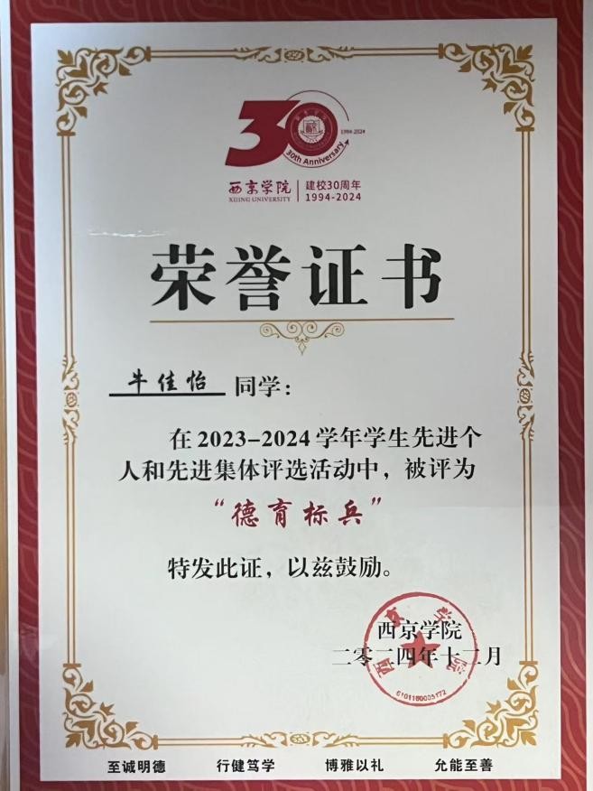 牛佳怡同志始终将政治建设摆在首位,时刻以优秀党员的标准严格要求自己。她系统深入学习党的创新理论,深刻领会国家方针政策,不断提升政治素养,作为班级团支书,她积极发挥党的助手和后备军作用,精心组织“思想旗帜”、“坚强核心”等主题学习会和团辅活动,引导支部成员深学细悟党的理论精髓,端正思想航向,追求政治进步,将理论学习融入日常、化作经常,成为同学们信赖的“思想引路人”。荣获西京学院第十期“青马工程”大学生骨干培训班“优秀学员”“五好学生”“德育标兵”“优秀学生干部”“优秀团干部”等荣誉称号。