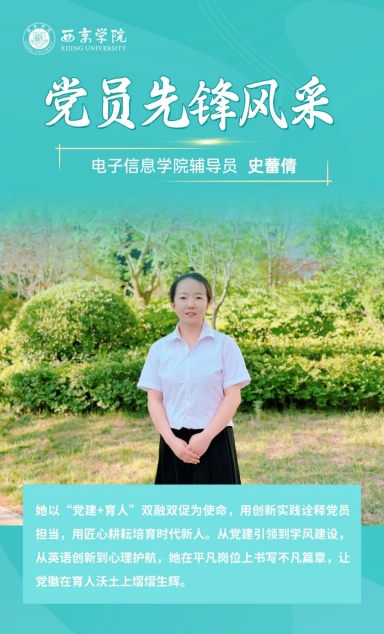 从教三年来,史蕾倩同志以“党建+育人”双融双促为核心,以共产党员的赤诚与教育工作者的匠心,在平凡的岗位上书写不平凡的篇章。她以党建为舵、以育人为帆,用实际行动诠释了“一名党员就是一面旗帜”的深刻内涵,牢记嘱托、不负韶华,秉持“价值引领 优势成长”的学生工作理念,以创新为笔、以奉献为墨,在西京学院的教育沃土上书写育人华章,让党徽在平凡岗位上绽放出耀眼光芒!