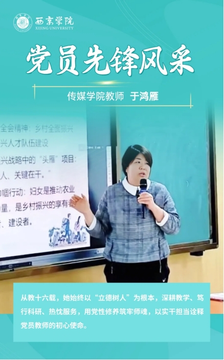 作为一名共产党员,于鸿雁同志始终以“立德树人”为根本任务,将党性修养深度融入教学实践,恪守“学高为师,身正为范”的信念。教学中,她坚持以学生为中心,精心设计课程与评价体系,充分尊重学生个性差异,积极鼓励学生结合自身特长参与学科竞赛;同时,作为传媒学院第四党支部书记和广播电视编导专业教学督导,她始终坚守党员初心和使命,结合自身丰富工作经验,从教学设计、教案撰写、课堂授课等三个核心维度,助力青年教师快速站稳讲台,切实推动学院整体教学质量提升。