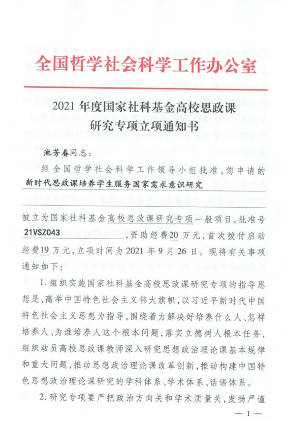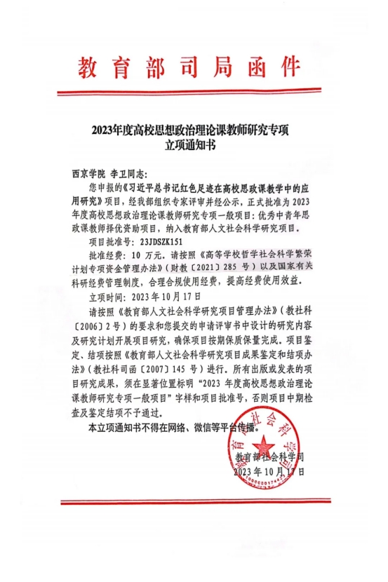 教研部高度重视科研工作,成员们积极投身学术研究,取得了突出成果。主持国家社科基金思政专项项目1项、教育部人文社科研究高校思政课教师研究专项(优秀中青年思政课教师择优资助项目)1项、陕西省社会科学基金年度项目1项、陕西省哲学社会科学研究专项项目2项、陕西省教育厅人文专项科研计划项目1项、西安市社科规划基金课题2项。