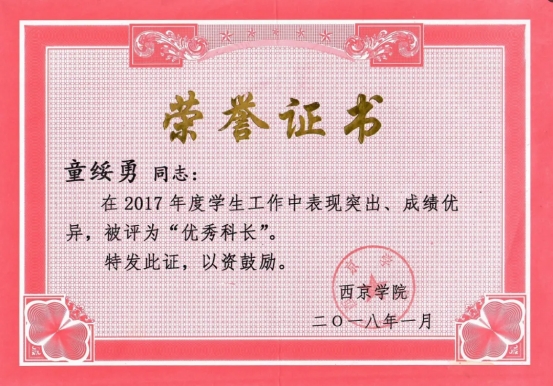2017年 获西京学院“优秀科长”称号;
