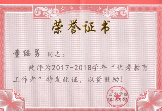 2018年 获2017-2018年度“西京学院优秀教育工作者”称号;