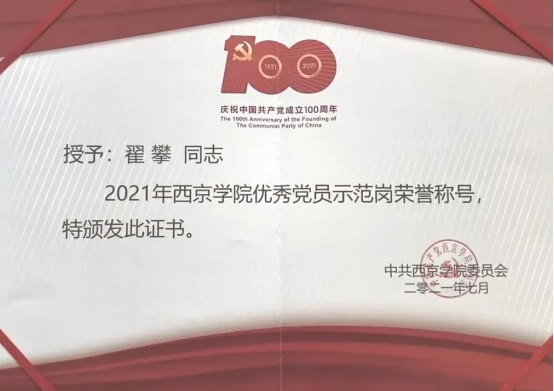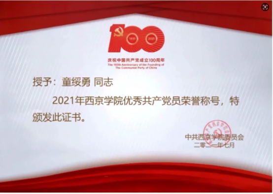 2021年 获西京学院“优秀共产党员”荣誉称号;