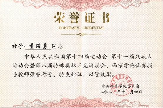 2021年 获西京学院十四运会和残特奥会优秀指导教师荣誉称号;