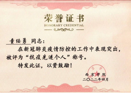2022年 获西京学院抗疫先进个人称号;