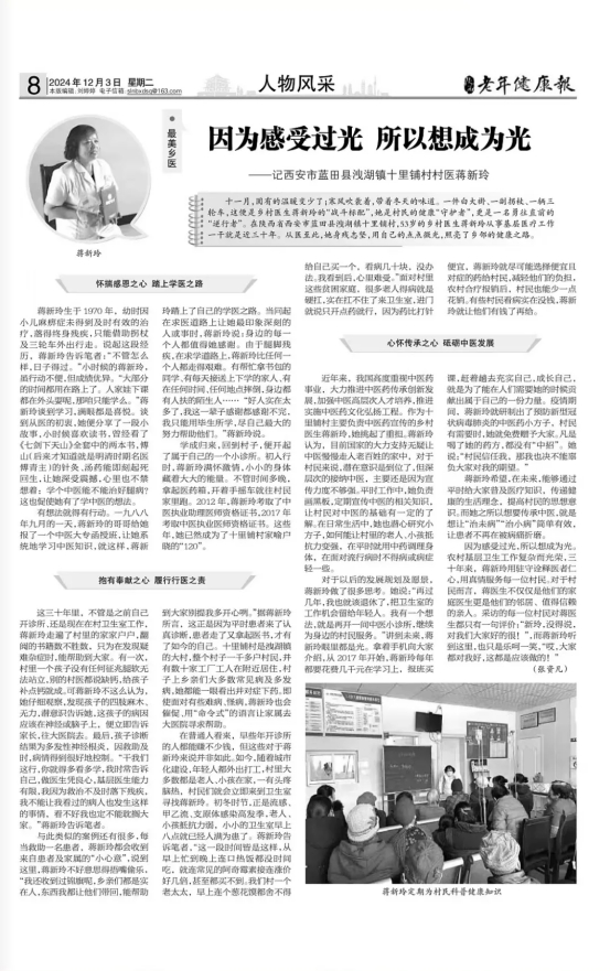 作为一名党员教师,她始终牢记使命,以身作则,率先垂范,用实际行动诠释党员的先锋模范作用。身为系主任,她秉持严谨态度与创新思维,立足实际,扎实推进专业建设,优化课程体系,提升教学质量,为护理专业发展增添动力。她关心学生、关爱同事,积极参与学校的各项活动,为学校的建设和发展贡献自己的力量。她积极参与党员志愿服务活动,用自己的专业知识为社会服务,展现了党员教师的风采。未来,她将继续秉持党员先锋精神,为护理专业的教育事业贡献更多力量,培养更多优秀的护理人才,用温暖和爱照亮更多学生的心灵。