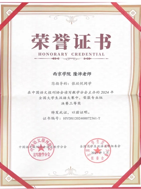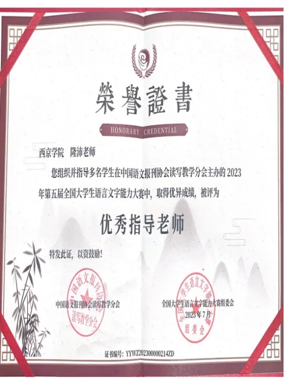 助力学生成长。他积极认真辅导学生参加专业相关赛事。所指导多名学生在第五届全国大学生语言文字能力大赛、第六届全国大学生语言文字能力大赛、2023年全国大学生汉语大赛、2024年全国大学生汉语大赛、第三届全国大学生普通话大赛中获得佳绩。