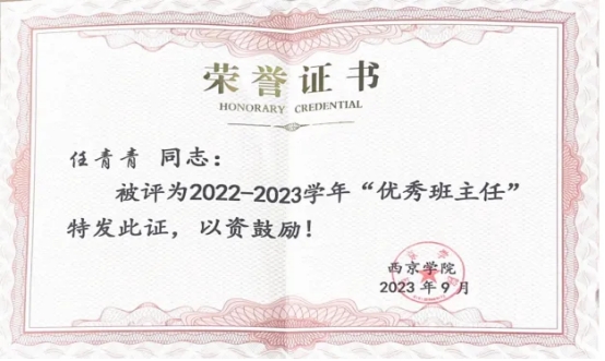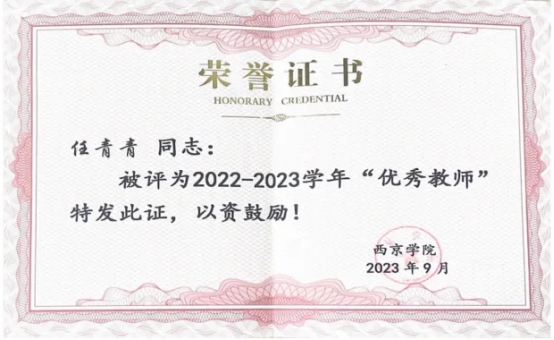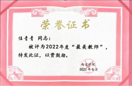 任青青在教学、科研、实践、育人等领域成果斐然。斩获西京学院优秀教师、优秀班主任等10余项校级及以上荣誉;课程获第六届青教赛校赛三等奖,入选西交利物浦大学产教融合创新案例;获全国高校教师技能创新大赛一等奖;主持省级以上项目6项;在北大核心、CSSCI 扩展版等期刊发表3篇论文;荣获3项赛事“优秀指导教师”称号;指导学生完成2项省级、1项校级大创项目;助力学生在国家级、省级赛事中揽获近40项奖项。全方位展现出其扎实的专业能力与卓越的育人成效。