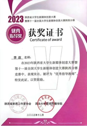 4.在全国大学生广告艺术大赛、陕西省大学生新媒体创意大赛等学科竞赛以及指导学生毕业设计(论文)创作过程中,成绩显著,多次被评为“优秀指导教师”。